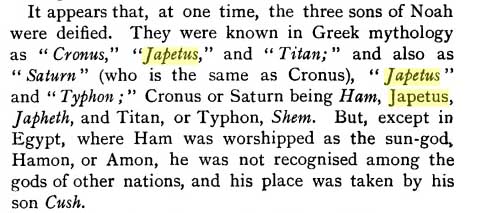 The Christian connection Through Noah and the Flood. The story of the flood is symbolic and the children of Noah have been related to the Titans, with the adaptation of the name Iapetos into the name Japeth, one of Noah's sons. Hence my favoured pronunciation of JAY_petus.