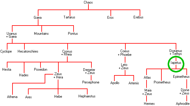 "IAPETOS (or Iapetus) was one of the Titan gods, sons of Ouranos (Heaven) and Gaia (Earth). Led by Kronos, Iapetos and his brothers conspired against their father, preparing an ambush for him as he descended to lie with Earth. Krios, Koios, Hyperion and Iapetos were posted at the four corners of the world where they seized hold of the Sky-god and held him fast, while Kronos, hidden in the centre, castrated him with a sickle.